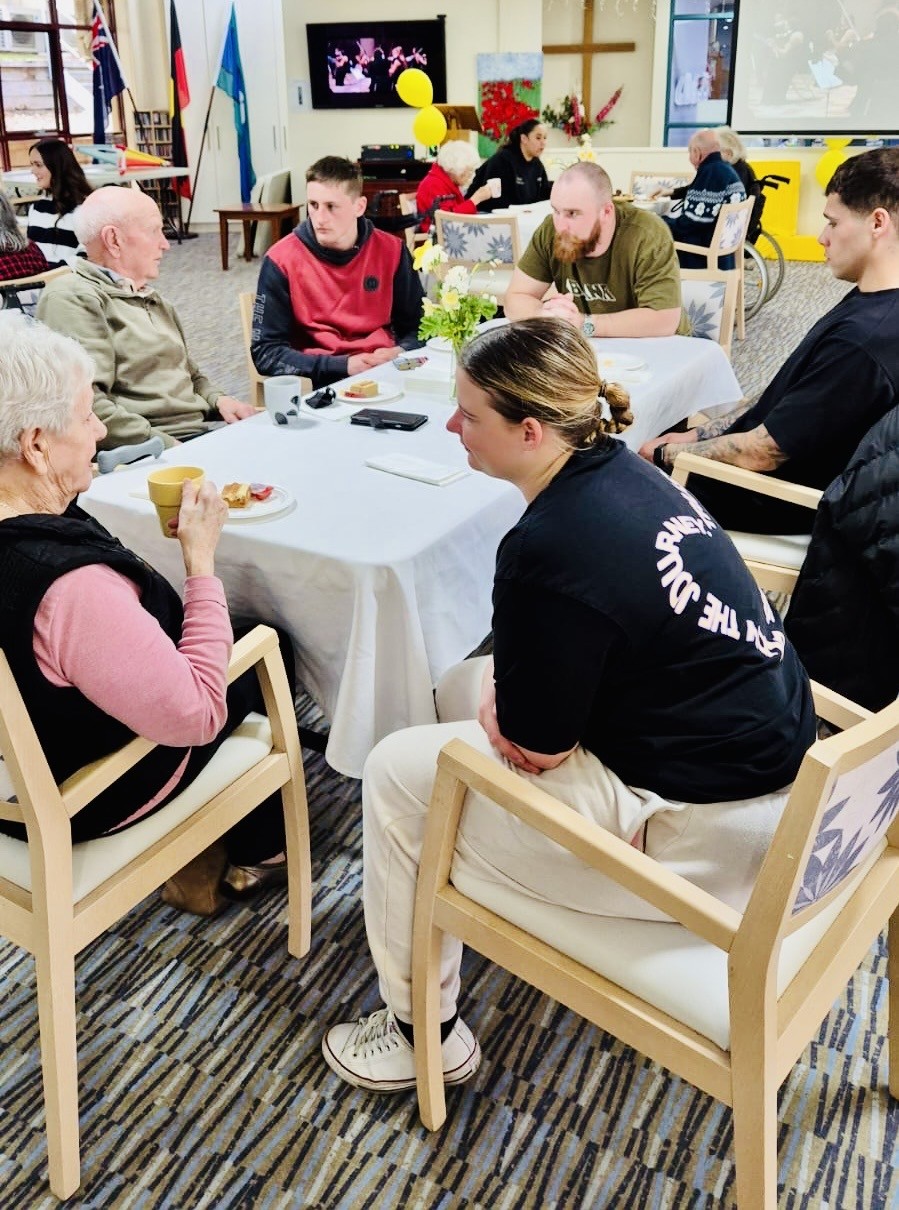 Residents at Vasey RSL Care Frankston South are delighted to have new regular visitors. A group of trainees from HMAS Cerberus visit once a month to meet and chat with our veterans over afternoon tea.